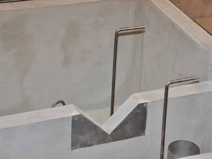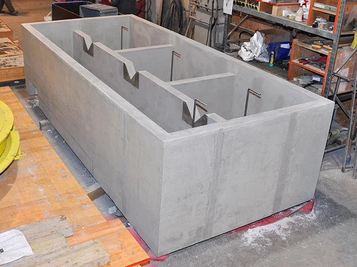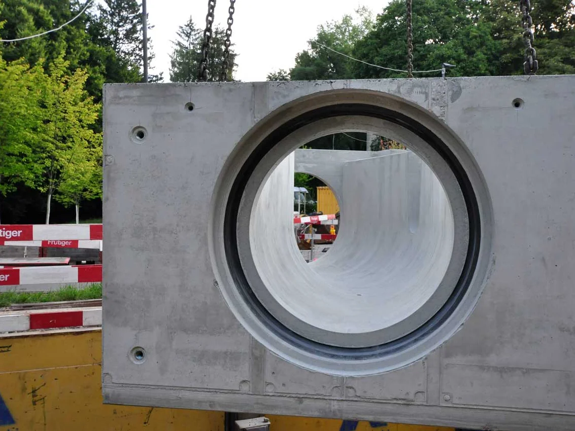 Masse 1000 x 310 x 270 mm, Wasserkanal 110 x 110 mm mit integrierter Steckmuffe für Anschluss Rohr PE DN 110 mm, Oberfläche Sichtbeton glatt, vollkantig.