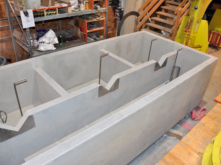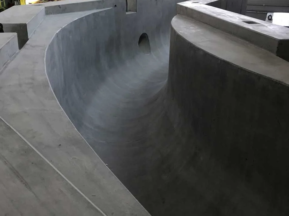Gestaltungselemente, auf Mass gefertigte gerade und gebogene Sitzbankelemente 200 x 50 x 50 cm mit integrierten Pflanzentrog Elementen, Oberfläche Sichtbeton.